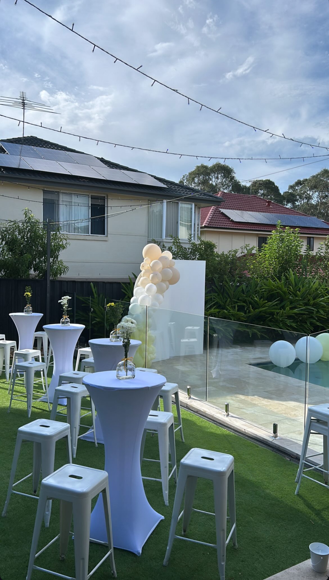 At Star Party Hire, we offer a variety of bar furniture to suit different event styles. Our wooden bar tables stand at a height of 1050mm, making them perfect for social gatherings and events where standing or casual seating is preferred. When paired with our steel bar stools, available in classic white and black, they create a sleek and modern bar area. The stools have a seat height of 650mm, providing comfort and support for guests as they enjoy the event. Each bar table can comfortably seat up to four stools, ensuring plenty of seating for your guests while maintaining an open, spacious feel.