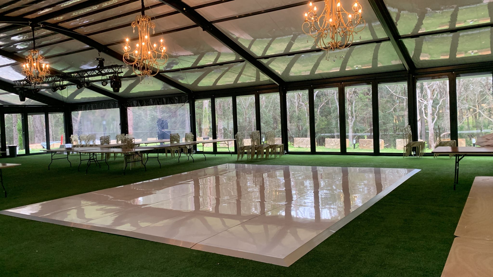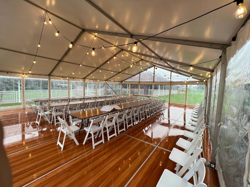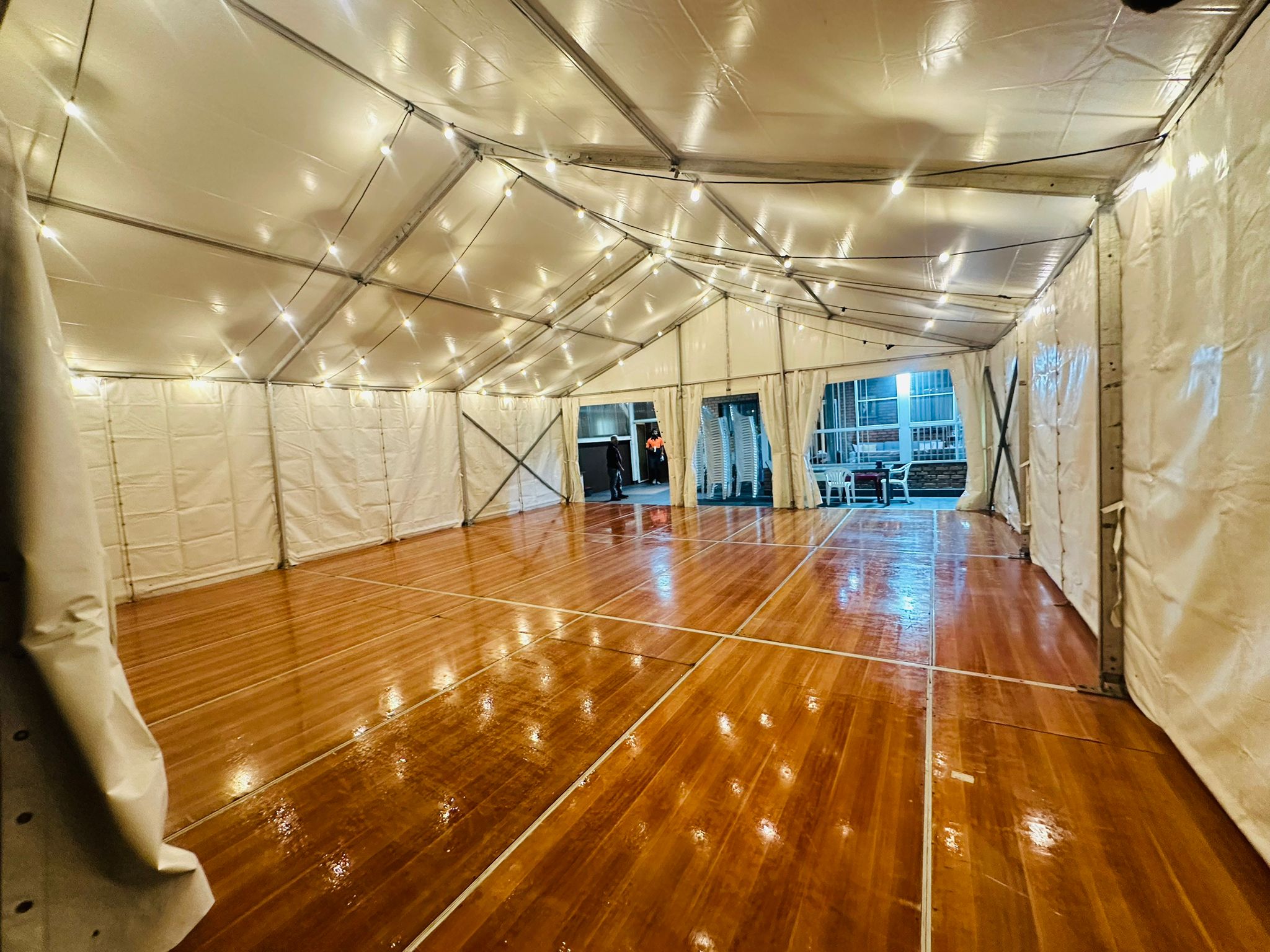 For wooden flooring, this option is waterproof as well and is suitable for the structured marquees. However, we do not allow wooden flooring to be hired on its own as it is integrated within our structured marquees when our team installs. When providing a quote, base frames must also be available, as they are essential for installation. The wooden flooring rises 10cm off the ground and can accommodate a maximum slope of 30cm.