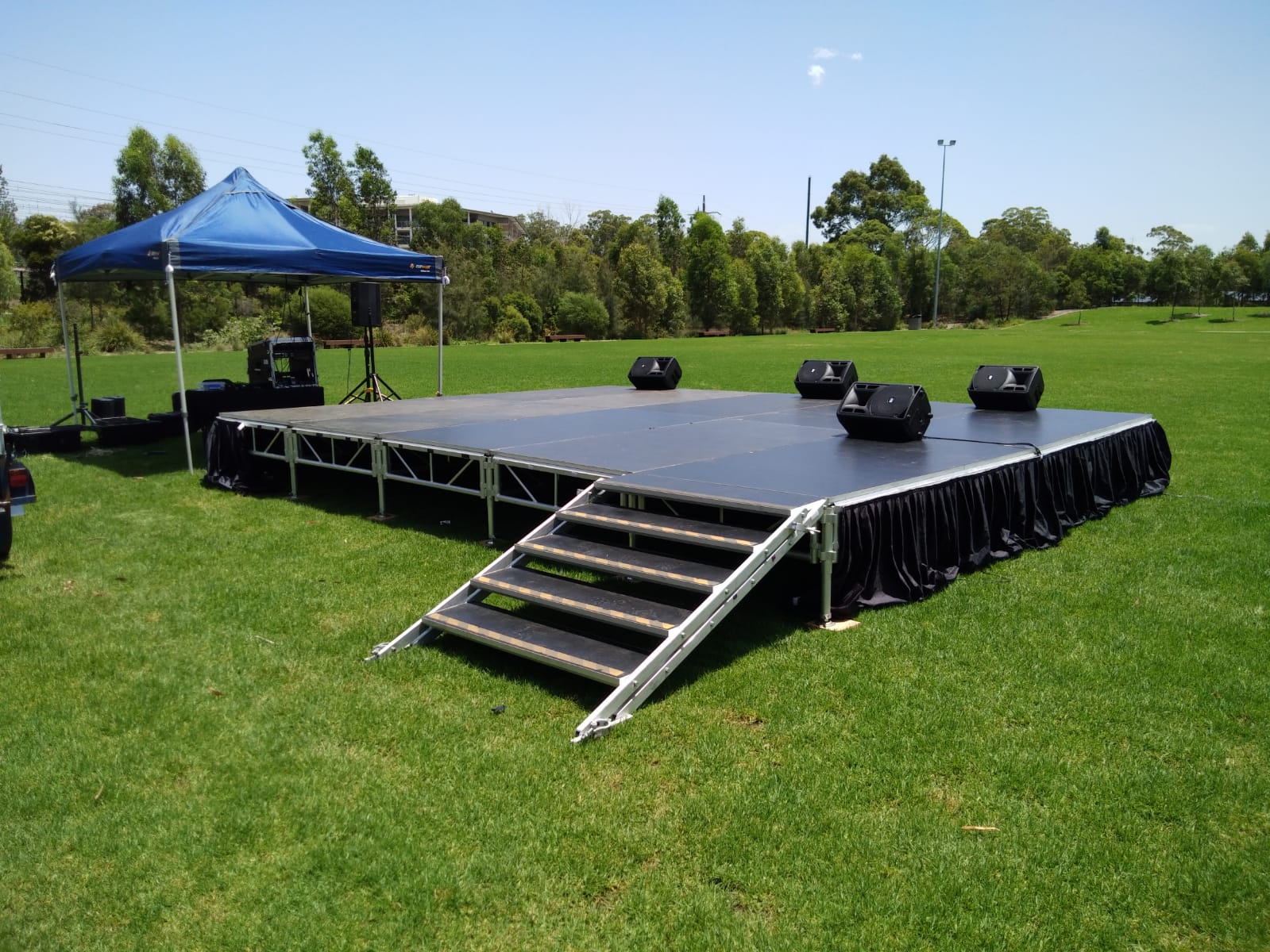Our stage hire services offer versatile and durable solutions for events of all sizes. The standard stage block size is 2.4m x 1.2m, but we also provide smaller 1.2m x 1.2m blocks to cater to different stage layouts. The blocks are made from wood, ensuring a sturdy and reliable platform for performances and speeches. The stage blocks are available in black, and stage covers must match or exceed the stage's dimensions; smaller covers are not permitted. Stages can be set up on various surfaces, including grass, concrete, and carpet, providing flexibility for different venues.