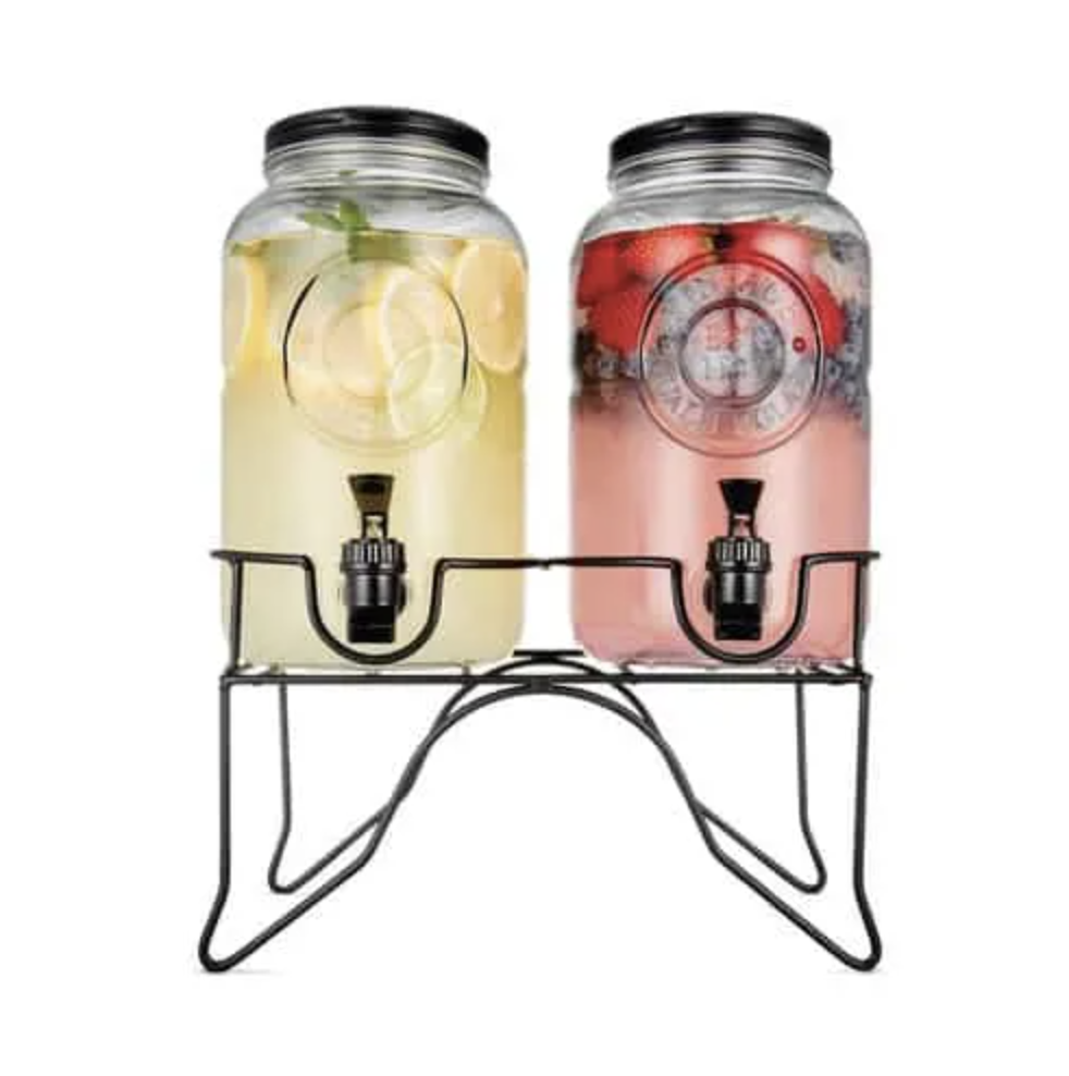 For beverages, we offer glass drink dispensers, including a twin drink dispenser with 3.5L per side and a 5.6L dispenser that comes with a stand. The champagne bowl can hold a maximum of 4 bottles. Additionally, for cold storage, we have three esky sizes: 80L, 120L, and 150L.